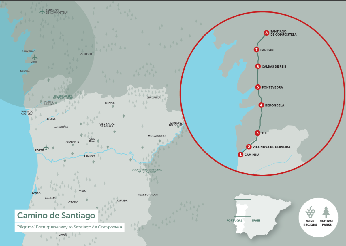 Innenfor festningsmurene ligger en sjarmerende labyrint av brosteinsgater med håndverksbutikker, lokale spesialiteter og balkonger pyntet med blomster som virkelig gjenspeiler Minho-tradisjonens sjel. Et av høydepunktene er krysningen av elven Minho fra Valença til Tui i Spania via en ikonisk bro.Her forandres landskapet: havutsikten byttes ut med frodige, grønne åser i Galicia. Regionen byr på storslåtte utsikt over skoger, daler og bølgende landskap, med spektakulære utsiktspunkter underveis.